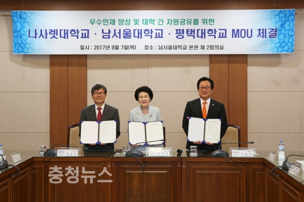나사렛대학교(총장 임승안), 남서울대학교(총장 공정자), 평택대학교(총장 이필재)는 7일 남서울대 본관 1층 국제회의실에서 우수인재 양성과 자원공유를 위해 손을 맞잡았다.