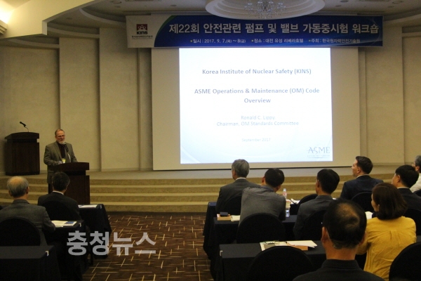 먼저 이번 워크숍 특별강연에 초청된 ASME OM 위원회(미국기계학회 원전 가동중시험 코드 위원회) Ronald C. Lippy 위원장은 ‘ASME OM Code*(IST) Overview’라는 제목으로 가동중시험 코드요건 전반의 최신 현황에 대한 발표를 진행했다.