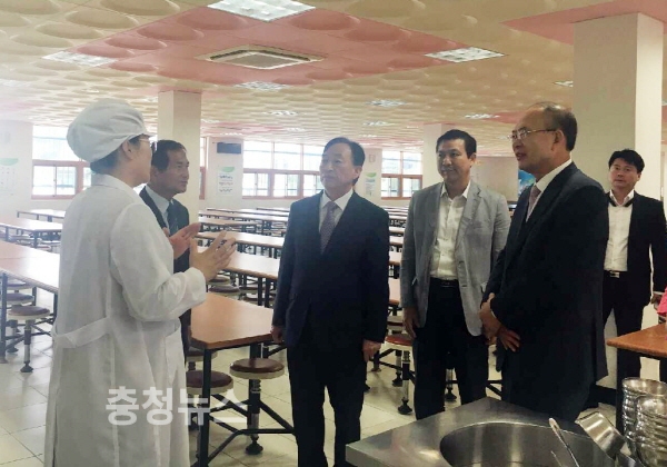 설동호 교육감이 영양교사에게 설명을 듣고 있다.