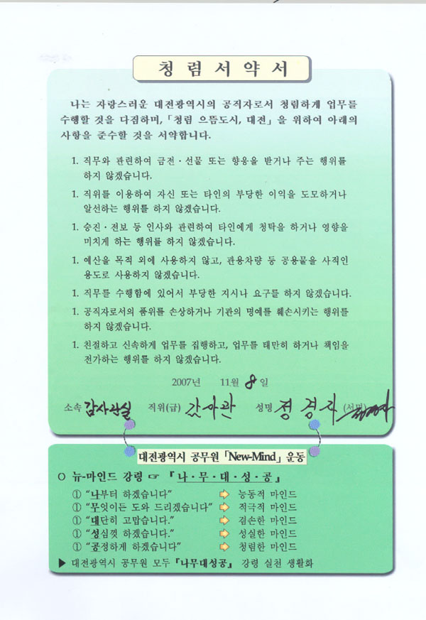 시는 또, 전직원을 대상으로 공․사 생활에서의 청렴 생활화, 직위를 이용한 청탁․알선 배제 등의 내용을 담은 ‘청렴서약서’를 받아 서약 위반자에 대해서는 지위고하를 불문하고 엄정조치한다는 계획이다.