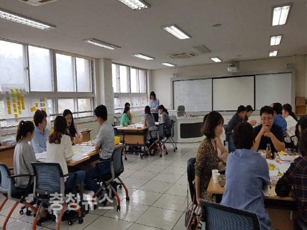 세종시교육청이 분임활동의 토론 촉진자 역할을 담당할 교원 26명을 대상으로 「소통으로 테이블 퍼실리테이터 역량 키우기 워크숍」을 운영했다. 사진은 9일(토), 조치원신봉초등학교에서 진행 중인 연수 장면