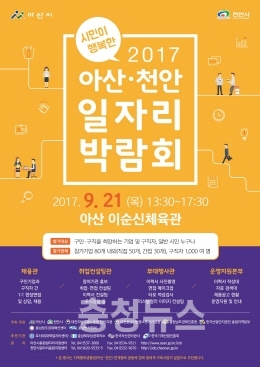 충남 아산시는 천안시와 공동으로 오는 21일, 아산 이순신체육관에서 ‘2017 아산․천안 일자리박람회’를 개최한다.