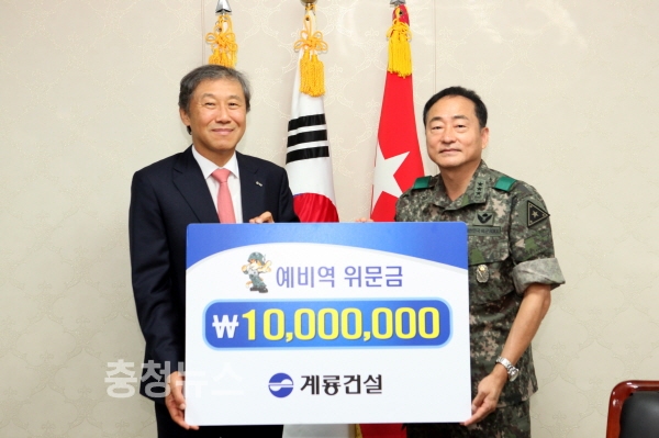 계룡건설은 11일 육군본부에서 김해석 육군 인사사령관(중장)에게 ‘예비역 추석 명절 위문금’ 1000만원을 전달했다.
