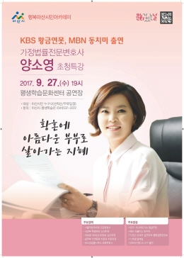 충남 아산시 평생학습관(관장 김오직)에서 오는 27일 가정법률전문변호사인 양소영 씨를 초청해‘황혼에 아름다운 부부로 살아가는 지혜’라는 주제로 행복아산 시민아카데미를 개최한다.