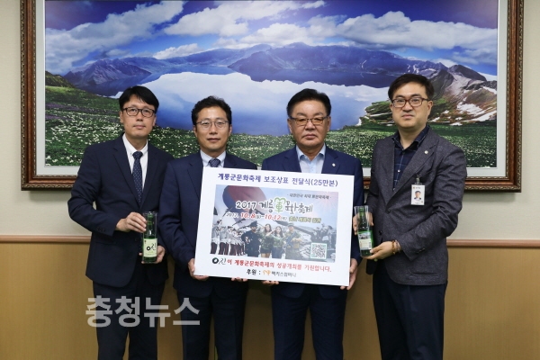 계룡軍문화발전재단(이사장 최홍묵)은 지난 11일 김규식 부사장을 비롯한 남부지점장 등 임원들이 계룡시를 방문해 제10회 계룡軍문화축제 홍보를 적극 지원하기로 하고 O₂린 소주병 보조라벨 전달식을 가졌다고 밝혔다.