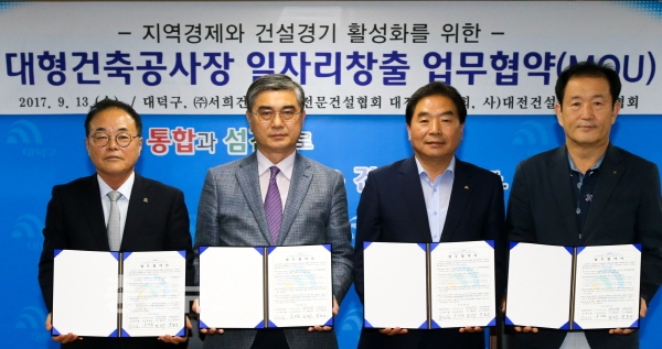 대전 대덕구(구청장 박수범)는 지난 13일 오후 대형건설업체인 ㈜서희건설(대표 곽성기)과 손을 잡고 지역경제 살리기와 일자리 창출을 위한 업무협약(MOU)을 체결했다.