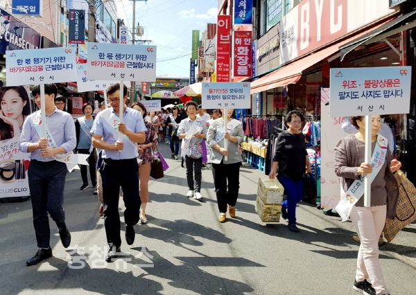 충남 서산시가 15일 민족 고유의 명절인 추석을 앞두고 불공정거래 행위를 근절하기 위해 물가안정 캠페인을 펼쳤다.
