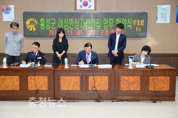 이에 따라 홍성군은 18일 군청 회의실에서 김석환 군수를 비롯한 맹훈재 경찰서장, 방혜옥 편의점 대표와 함께 「여성안심지킴이집 운영 협약」을 체결하고, 촘촘한 지역사회 안전망 구축을 위해 힘을 모을 것을 약속했다.