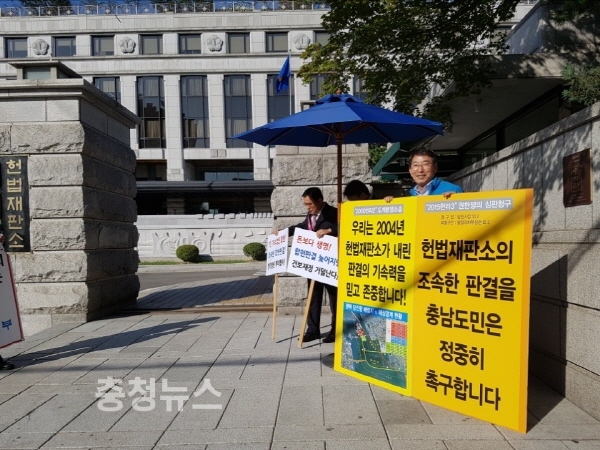 당진시의회(의장 이종윤) 12명 의원들은 18일부터 서울 헌법재판소 앞에서 당진평택항일원 당진시 관할 당위성 호소를 위한 1인 피켓시위 활동을 시작했다.