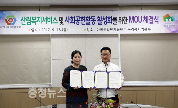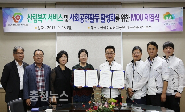 산림청 한국산림복지진흥원(원장 윤영균)은 18일 국립칠곡숲체원(원장 조두연)이 (사)구미산업단지 경영자협의회(회장 서인숙)와 경북 구미시 공단동 한국산업단지공단 대구경북지역본부에서 산림복지서비스 제공 확대 등을 위한 업무협약(MOU)을 체결했다고 밝혔다.
