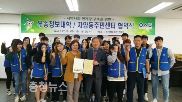 대전 동구 자양동 주민센터(동장 김숙례)는 우송정보대학(총장 정상직)과 19일 우송정보대학 4층 대회의실에서 우송정보대학 총장 및 학생 등 40여명이 참석한 가운데 소외계층 지원에 대한 상호 협력을 위해 협약을 체결했다고 밝혔다.