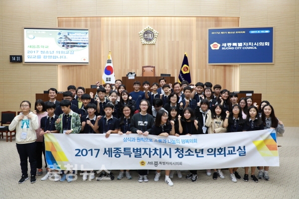 세종특별자치시의회(의장 고준일)는 19일 시의회 3층 본회의장에서 새움중학교 학생 35명을 대상으로 ‘2017년도 제3기 청소년 의회교실 모의의회’를 개최했다.