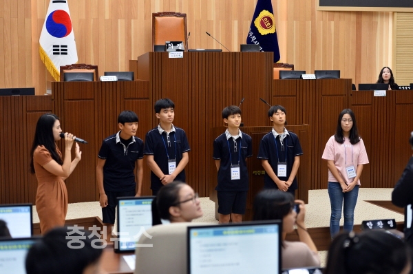 이날 참여한 학생들은 의회의 기능 및 전자회의에 대한 사전 교육을 받은 후 의회의 진행방식에 맞춰 입교식, 기념촬영, 스피치 특강, 모의의회, 설문조사 순으로 진행했다.