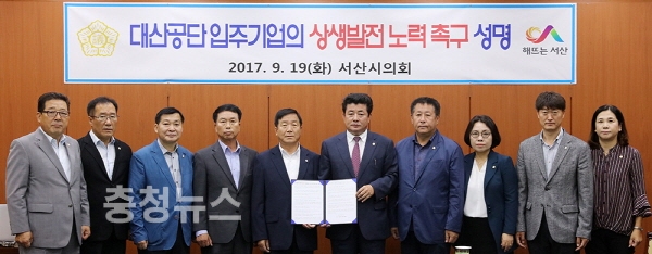 서산시의회(의장 우종재)가 19일 지역사회와 기업이 함께 발전하는 분위기를 만들기 위해 대산공단 입주기업의 상생 노력을 촉구하는 성명서를 발표했다.