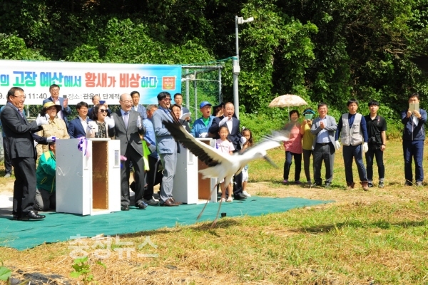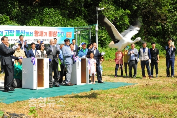 이어 황새 방사케이지 테이프커팅이 진행됐으며 테이프커팅과 함께 황새가 케이지에서 걸어 나와 힘차게 하늘로 날아갔으며 참석자들은 자연으로 방사되는 황새가 잘 적응하길 바라는 마음과 축하하는 마음으로 아낌없는 박수를 보내며 황새를 응원했다.
