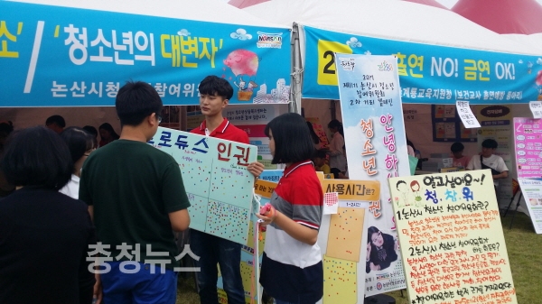 지난달 18일 제12회 논산시청소년문화제와 지난 16일 복지·건강박람회 행사장에서 펼쳐진 캠페인은 청소년 인권신장 관련 설문조사 및 관련 홍보물을 배부하며 청소년 인권 활동에 대한 홍보활동을 전개했다.