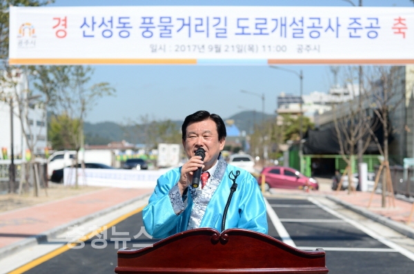 산성동 풍물거리길 도로개설공사 준공식에서 오시덕 공주시장 축사 모습