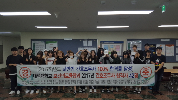 대덕대학교 보건의료융합과 2학년 학생 42명이 2017년 9월 2일에 시행된 간호조무사 자격시험에 응시하여 42명 100% 전원 합격의 쾌거를 이루었다. 전국 합격률은 75%를 나타내고 있지만, 대덕대학교 보건의료융합과 학생은 여름 방학부터 진행된 특화된 시험대비 프로그램을 통하여 100% 합격률을 보였고 대학의 위상을 높였다.
