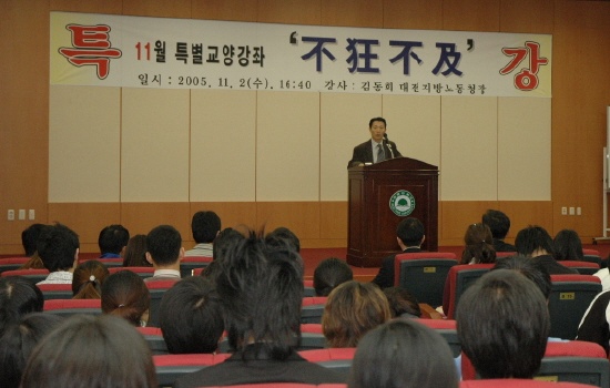 건양대학교(총장 김희수)는 2일 오후 4시 30분 교내 국제회의장에서 김동회 대전지방노동청장을 초청해 “不狂不及(불광불급)”이란 주제로 11월 특별교양강좌를 개최했다.