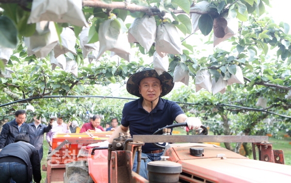구본영 천안시장은 지난 24일 성환읍 신가리 이종수(남, 61세)씨 농장에서 지역농협조합장을 비롯한 지역 관계자 40명과 천안수출배 수확에 나섰다.