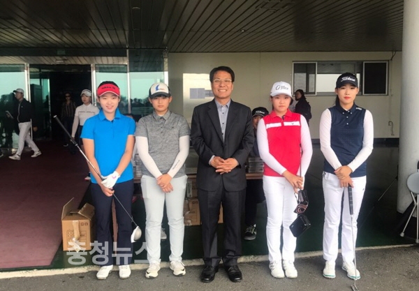 송현훈 한남대 학사부총장이 24일 군산CC에서 열린 ‘제4회 한남대 총장배 전국 주니어골프대회’에서 수상한 학생들과 기념사진을 촬영하고 있다.