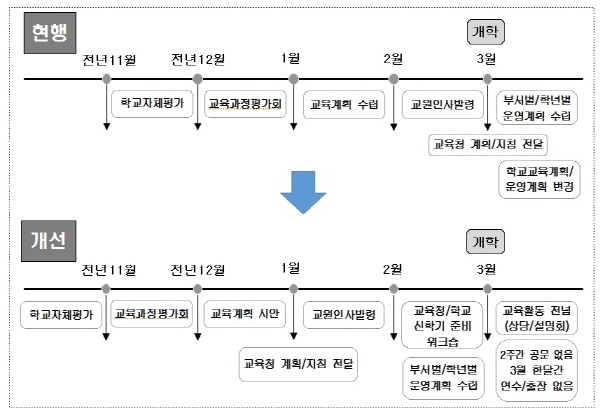 그동안 2월에 추진했던 3.1.자 인사 발표, 졸업식, 종업식, 학교생활기록부 마감을 1월달에 실시하고, 2월에는 ▲ 학교 교육과정 운영계획 수립 ▲ 학교생활기록부 마감 (2.28.) ▲ 2.1.자 겸임발령 ▲ 새학년 집중 준비 기간 운영을 통해 전직원이 함께 교육과정 운영에 대해 협의키로 했다.