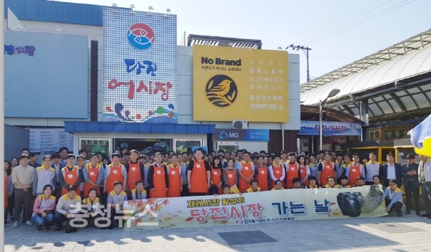 '당진시장가는날'을 위해 당진화력 직원들이 당진어시장 앞에 모여 기념촬영