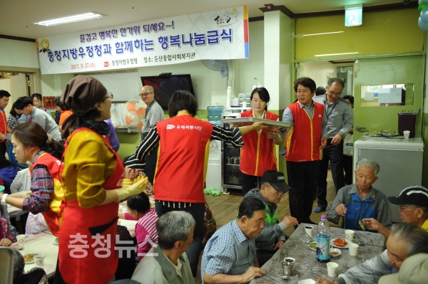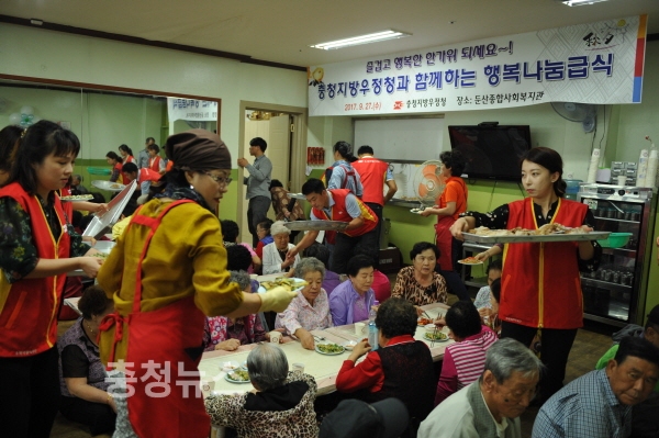 충청지방우정청(청장 이동형)은 27일 추석명절을 앞두고 대전 서구 둔산로에 위치한 둔산종합사회복지관에서 독거노인 등 어르신 200여명을 대상으로 무료급식 봉사활동을 펼쳤다