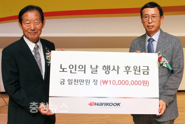 한국타이어(대표이사 서승화)는 27일 충남 금산군 소재 금산다락원에서 열린 금산군 노인의 날 기념식에서 박동철 금산군수, 태진수 대한노인회 금산지회장, 한국타이어 신동필 금산공장장을 비롯한 관계자 및 지역 어르신 1,000여명이 참석한 가운데 노인의 날 후원금 1,000만원을 전달했다.