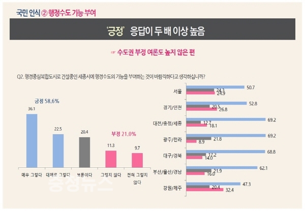 국민 대상 인식조사 결과는 ‘세종시에 행정수도의 기능을 부여하는 것’에 매우 그렇다 36.1%, 대체로 그렇다 22.5% 등 긍정적인 응답이 58.9%로, 그렇지 않다 11.3%, 전혀 그렇지 않다 9.7% 등 부정적 응답 21.0%보다 훨씬 높았다.