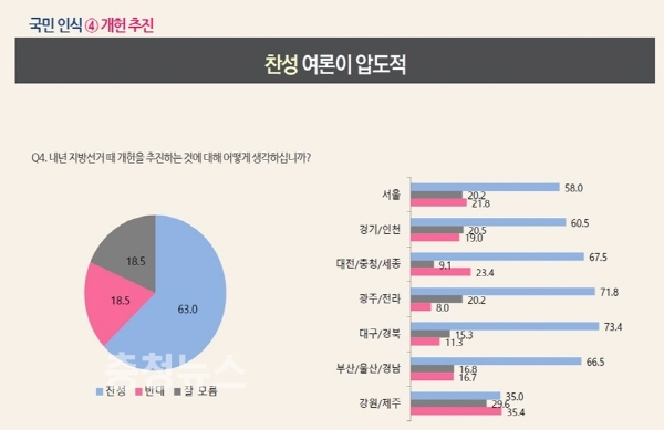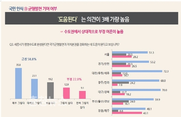 ‘국가균형발전과 자치분권 강화에 도움이 되느냐’는 질문에는 긍정이 58.8%, 부정이 22.0%로 나타나 긍정이 3배 높았다.