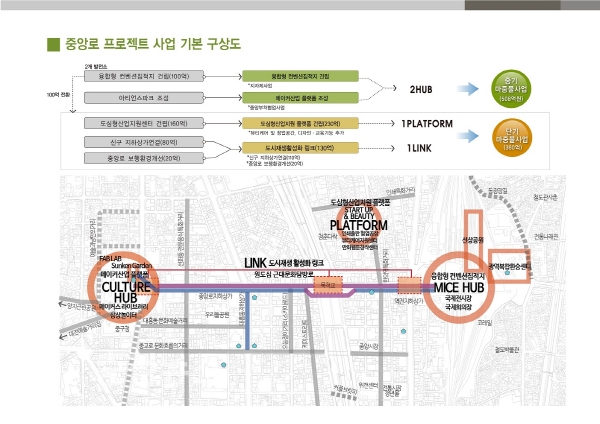 중앙로프로젝트는 ‘도심형산업지원플랫폼 건립’, ‘중앙로 신ㆍ구 지하상가 연결사업’, ‘중앙로 지하상가 보행환경 개선사업’으로 구성됐다.