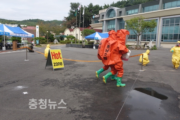 이날 모의훈련은 보건소장 회의에 참석하는 시·군 보건소장들에게 탄저균으로 의심되는 백색가루를 이용한 생물테러 발생을 가상하여 유관기관간 상황전파, 현장 출동 및 통제, 독소다중탐지키트 검사, 환경검체 채취 및 검체 이송, 환경제독과 테러범 검거 등의 과정을 실전처럼 훈련했다.