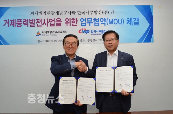 거제풍력발전사업 공동개발 양해각서를 체결한 한국서부발전김동섭 기술본부장(우측)과 거제해양관광개발공사 김경택 사장