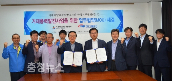 거제풍력발전사업을 공동개발하기로 양해각서를 체결한 한국서부발전과 거제해양관광개발공사 관계자들