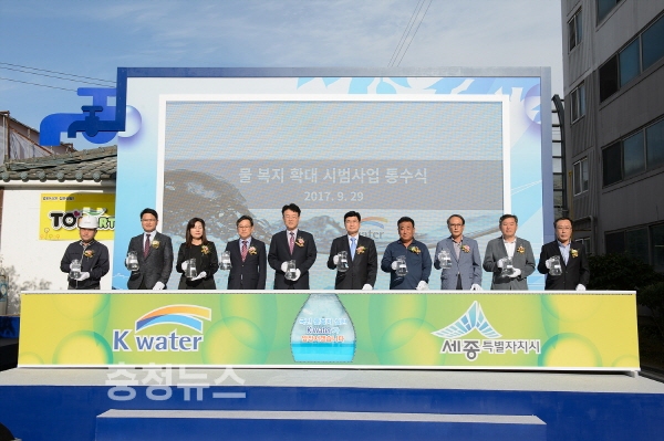 세종시(시장 이춘희)와 K-Water(사장 이학수)는 29일 소정면 무궁화아파트에서 수돗물 공급을 개시하는 통수식을 가졌다.
