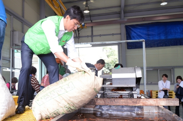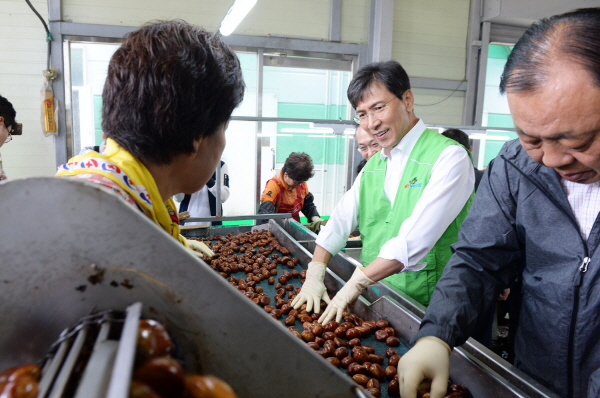 안 지사는 이날 정산농협 산지유통센터에서 티타임을 가진 후 곧바로 수출유통센터로 이동 추석성수식품인 밤 포장 및 배송작업이 한창인 근로자와 농업인을 격려했다.
