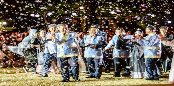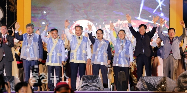 폐막식 주제공연이 끝나고 남궁영 충청남도 행정부지사, 이용우 부여군수 등 참석자들이 제63회 백제문화제의 성공적인 개최를 자축하며 박수치고 있다.