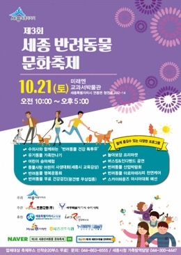 세종시(시장 이춘희)는 오는 21일 연동면 소재 미래엔 운동장(교과서 박물관)에서‘제3회 세종 반려동물 문화축제’를 개최한다.