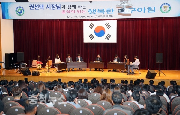 권선택 대전시장이 10일 서구청을 방문해 ‘시장과 함께 음악이 있는 행복한 서구아침’ 행사에서 직원들과 대화의 시간을 가졌다.