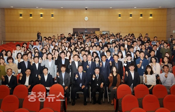 권선택 시장과 서구청 직원들이 단체 사진을 찍고 있다.