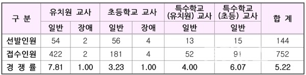 대전교육청(교육감 설동호)은 2018학년도 공립 유치원․초등학교․특수학교(초등․유치원) 교사 임용후보자 선정경쟁시험 원서접수 결과 144명 선발에 752명이 접수해, 평균 5.22대 1의 경쟁률을 보였다고 밝혔다.