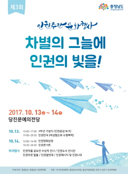충남도는 오는 13일부터 14일까지 이틀간 일 당진 문예의 전당에서 ‘차별의 그늘에 인권의 빛을’을 주제로 ‘제3회 인권주간 문화행사’를 개최한다고 11일 밝혔다.