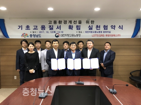 충남도와 대전지방고용노동청, 롯데지알에스㈜가 협약을 맺고 기초고용질서 확립을 위해 힘을 모은다.