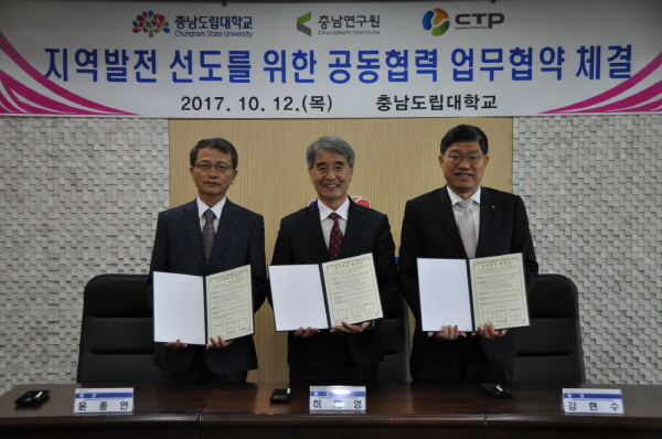 충남도립대학교(총장 허재영)는 12일 대학 대회의실에서 충남연구원 및 (재)충남테크노파크와 지역 발전을 선도할 인재를 양성을 위한 공동협력 업무협약을 체결했다.