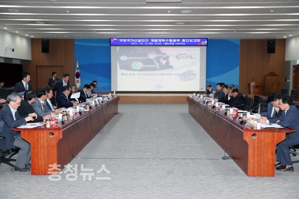 충남도가 12일 도청 대회의실에서 남궁영 행정부지사와 분야별 전문가, 도의원, 국방부 및 도 관계자 등 20여 명이 참석한 가운데 ‘국방산단 개발계획 수립용역 중간보고회’를 개최했다.