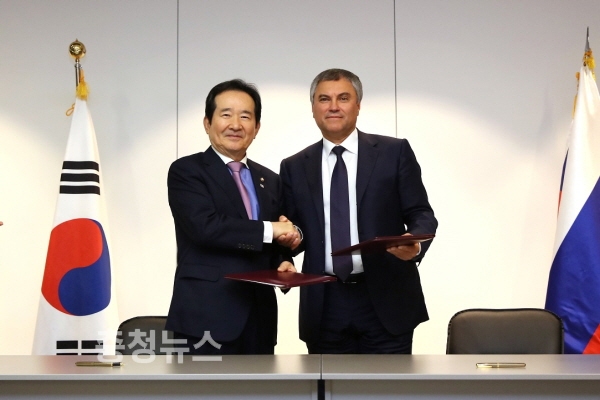 러시아를 공식 순방 중인 정세균 국회의장이 뱌체슬라프 빅토로비치 볼로딘 (Vyacheslav Viktorovich VOLODIN) 러시아 하원의장과 현지시간 14일 양국간 의회협력 발전을 위한 공동성명을 발표했다.