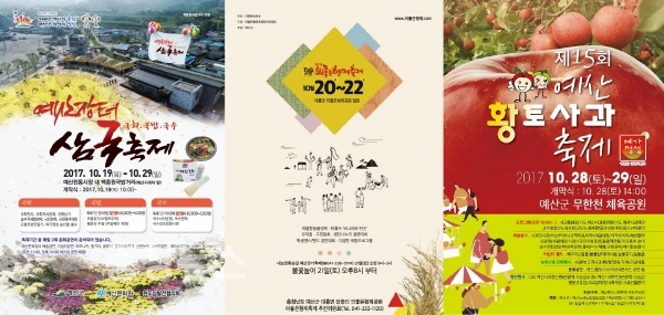대표적인 축제로 예산장터 삼국축제(10. 19.∼10. 29.)는 예산전통시장 내 백종원국밥거리에서 국화, 국밥, 국수를 테마로 먹거리, 볼거리, 즐길거리 모두를 만족시키는 축제를 준비하고 있으며, 의좋은형제공원 일원에서는 우리 전통문화를 계승하고 보존하는 의좋은형제축제(10. 20.∼22.)가 개최된다.