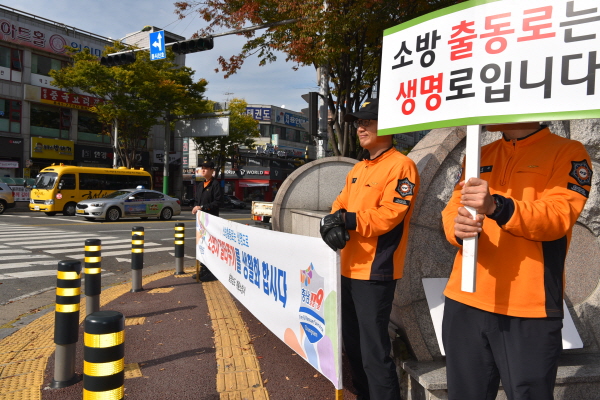 계룡소방서(서장 이규선)는 16일 계룡시 일원에서 소방차 현장 도착 목표 시간인 ‘골든타임’ 확보와 양보 문화 정착 및 확산을 위해 소방차량 길 터주기 훈련 및 캠페인을 펼쳤다.