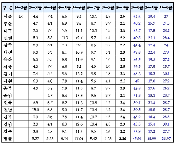 승진소요 기간이 가장 짧은 직급은 8급에서 9급으로 약2.3년으로 나타났다. 6급에서 5급 승진이 가장 기간이 많이 걸려 11년을 기록했으며, 세종시는 5.2년, 충남도와 경기도는 각각 13.3년과 13.2년으로 큰 차이를 보였다.
